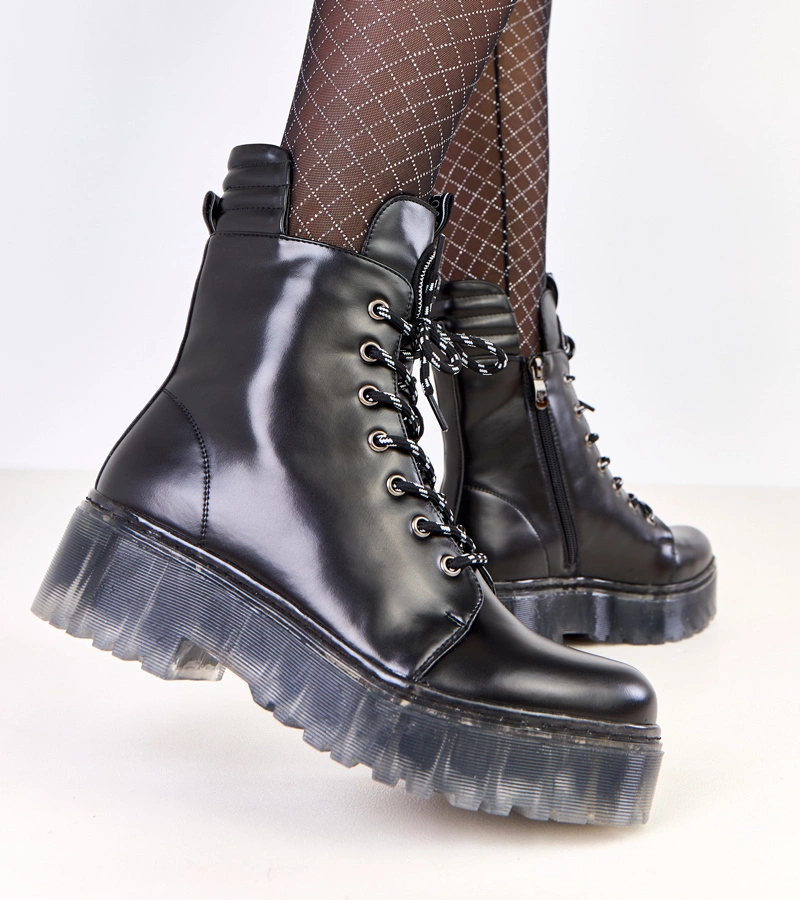 Hers Czarne śniegowce na platformie z futerkiem sznurowane