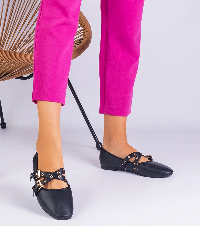 Hers baleriny damskie czarne z ekoskóry zdobione klamrami