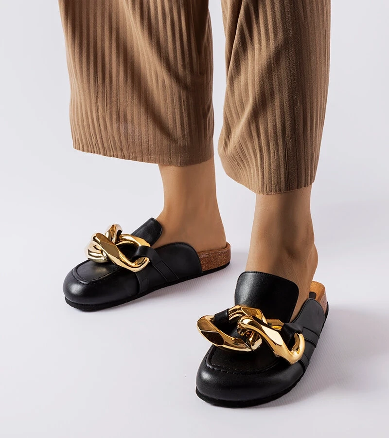 Czarne klapki zdobione łańcuchem