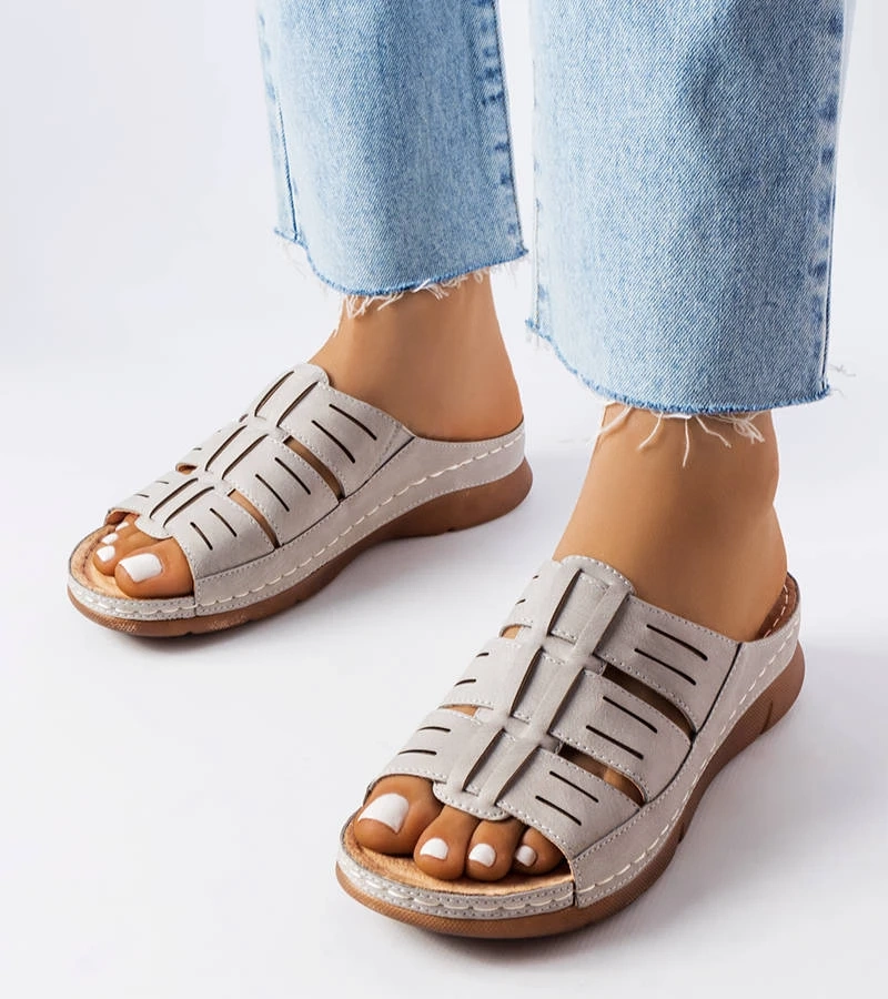 Beżowe eleganckie klapki ze zdobiona cholewką