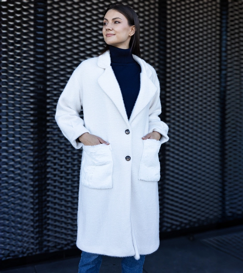 Długi biały płaszcz z pluszowymi kieszonkami