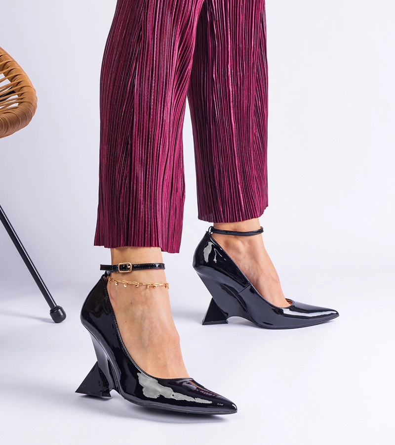 Hers czółenka damskie czarne lakierowane na koturnie
