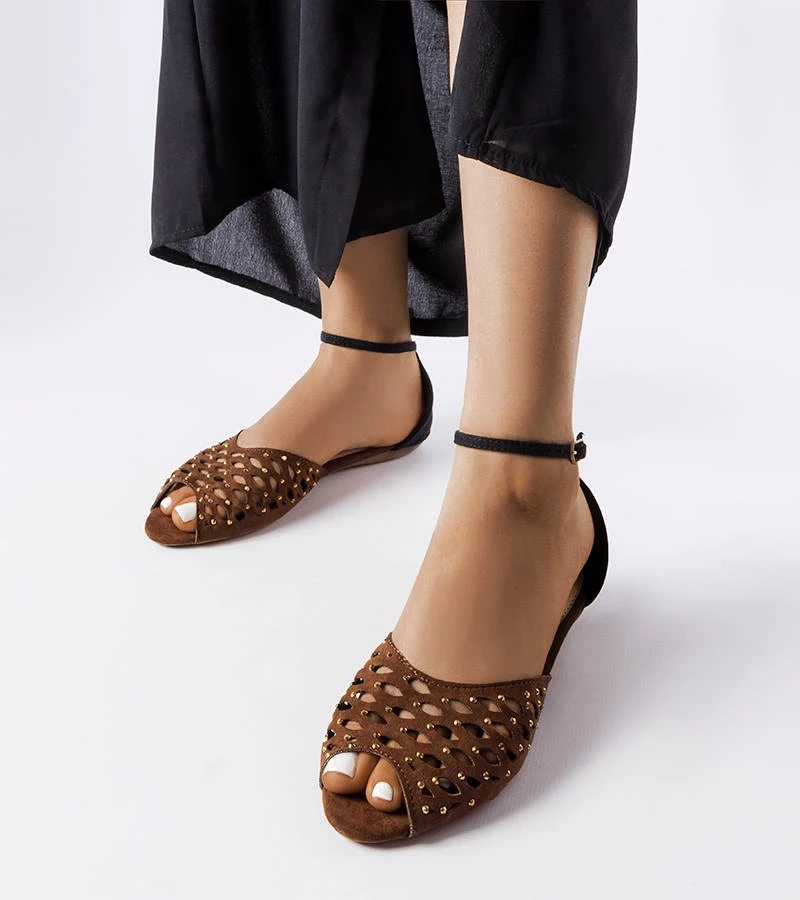 Hers Brązowe płaskie sandały zdobione cyrkoniami