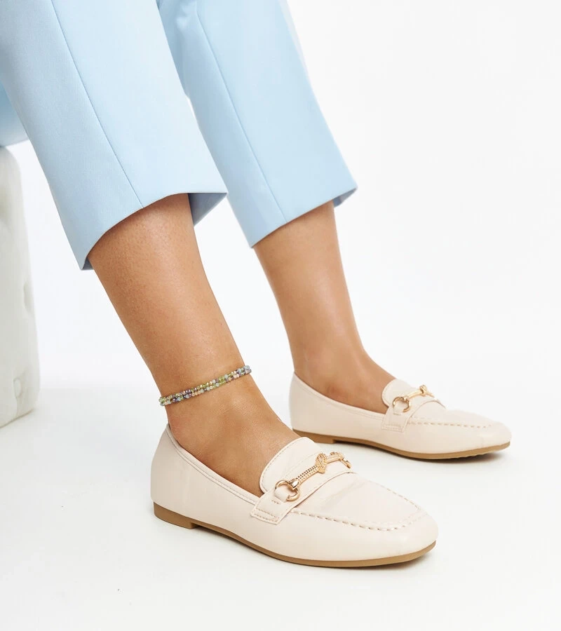 Jasnobeżowe mokasyny z błyszczącą aplikacją