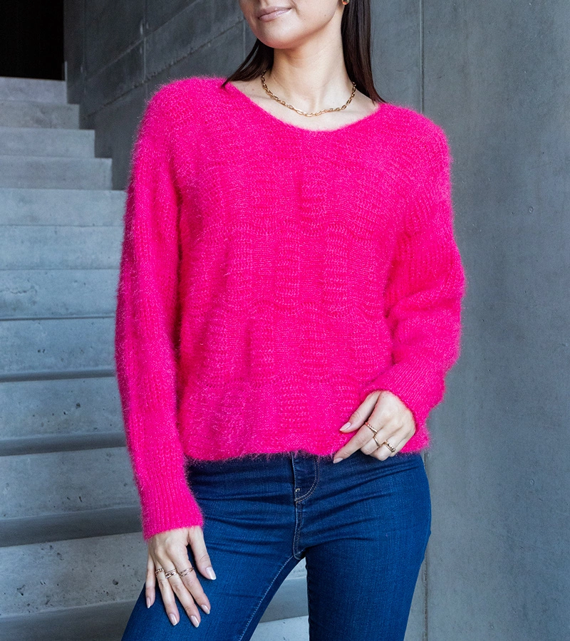 Sweter damski fuksjowy z krótkim rękawem ozdobne guziki