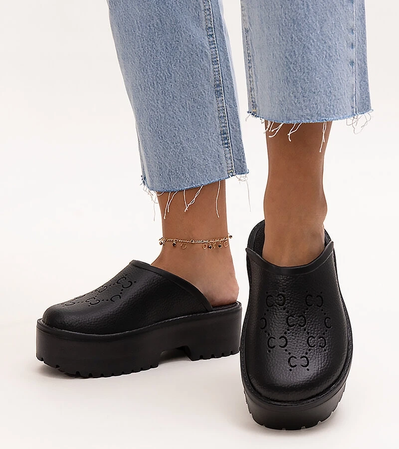 Czarne klapki na platformie z misiem i złotymi dodatkami
