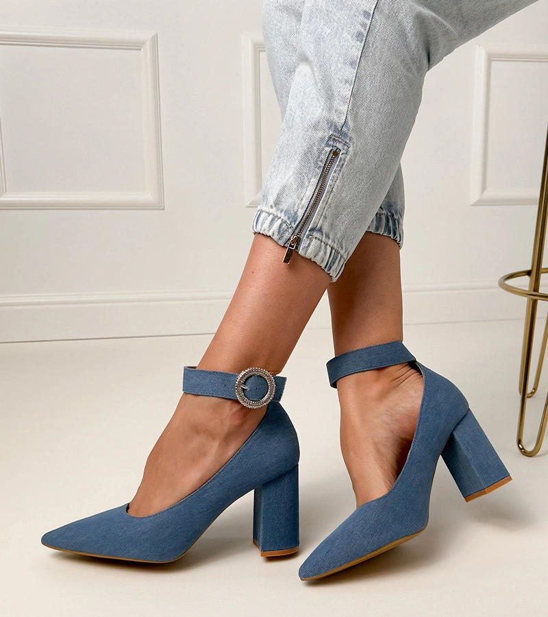 Hers Jeansowe czółenka na słupku ze sprzączką i cyrkoniami