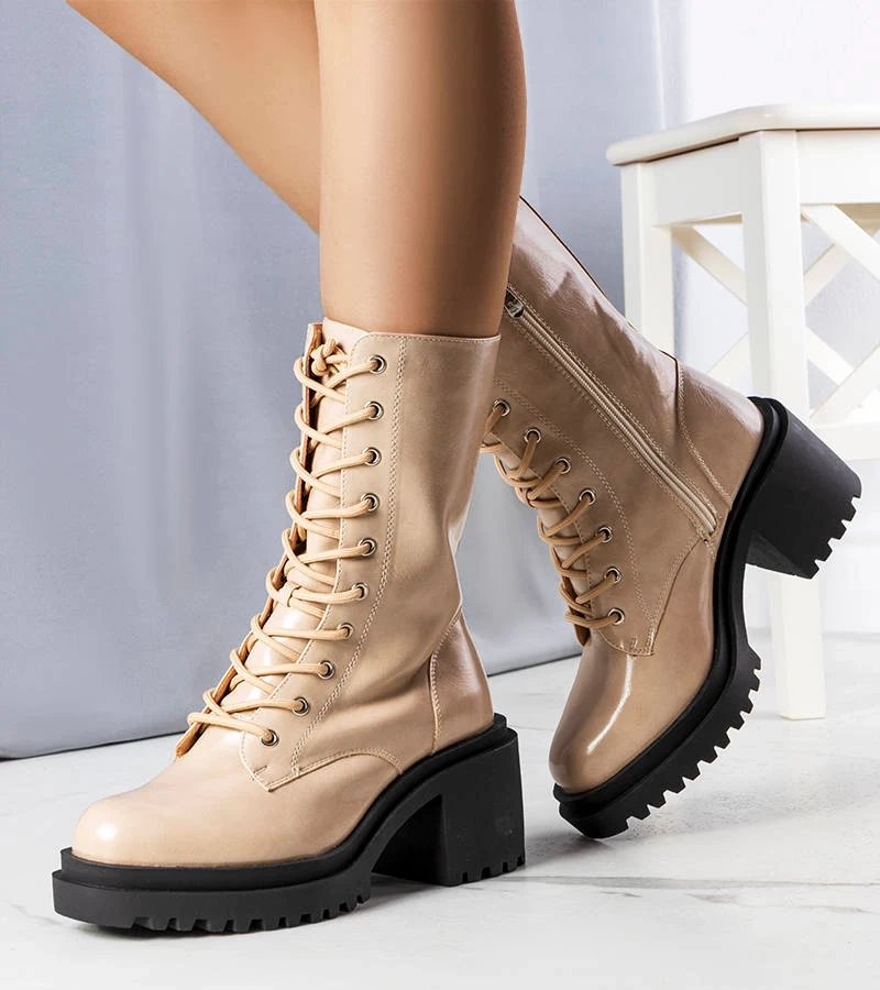 Beżowe ocieplane botki na obcasie z wiązaniem