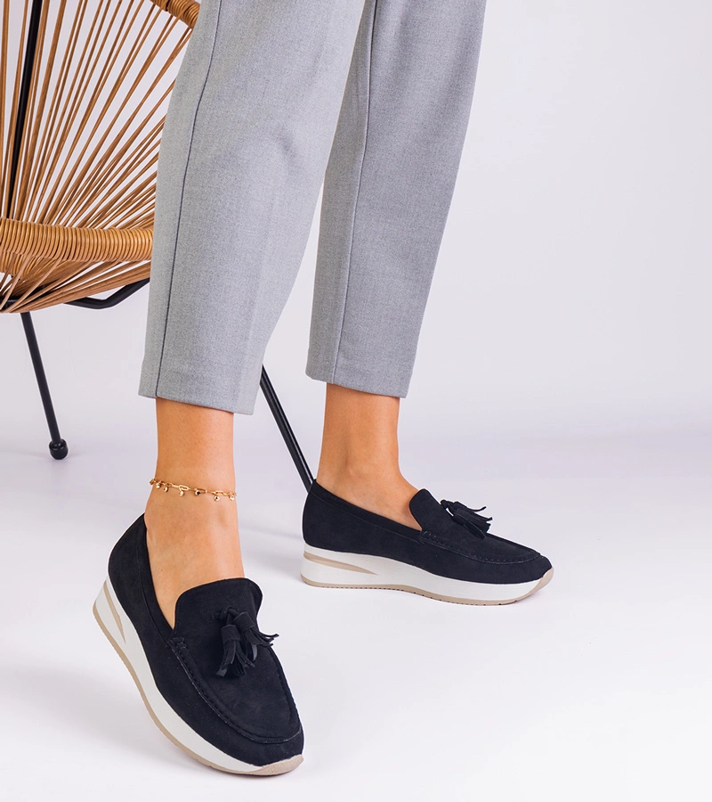 Hers Mokasyny Damskie Czarne na Platformie ze Zdobieniem