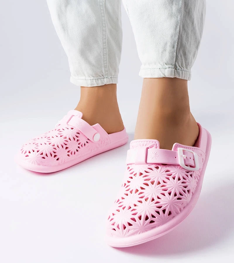 Ciemnoróżowe klapki gumowe ozdobione nadrukami