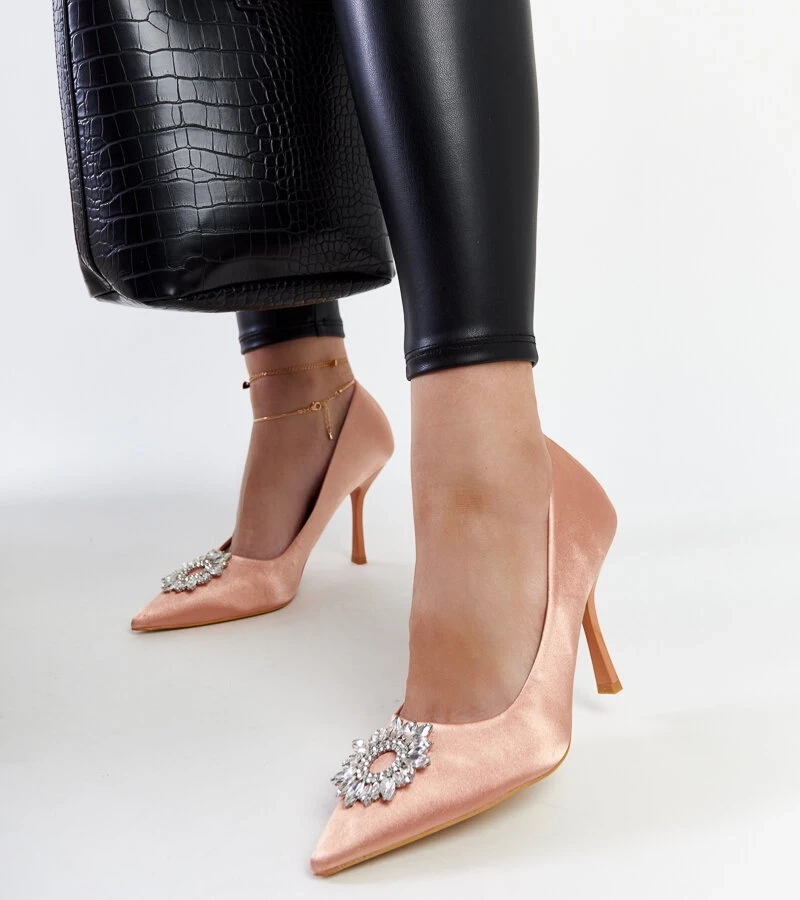 Różowe szpilki o satynowym wykończeniu z cyrkoniami