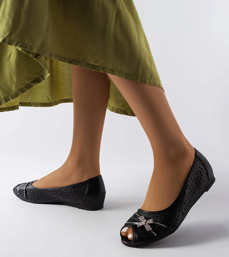 Czarne ażurowe balerinki zdobione cyrkoniami