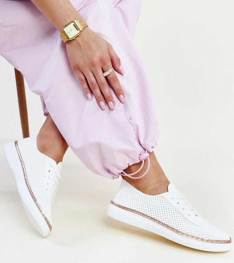 Biało-złote sneakersy na koturnie zdobione perforacją