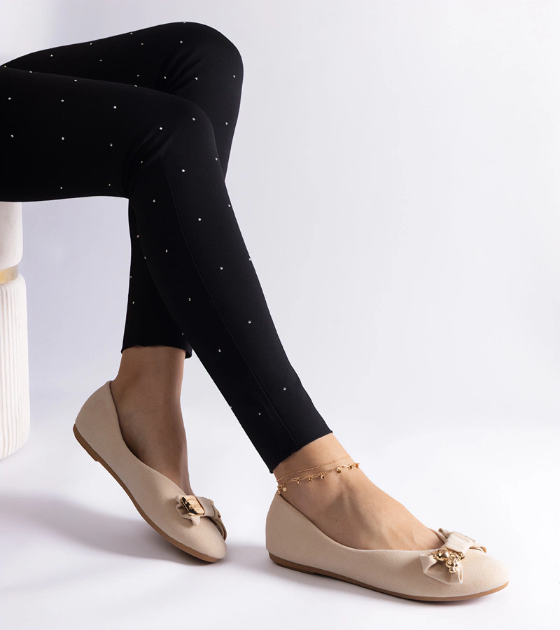 Hers baleriny damskie beżowe z kokardką i czarnym noskiem