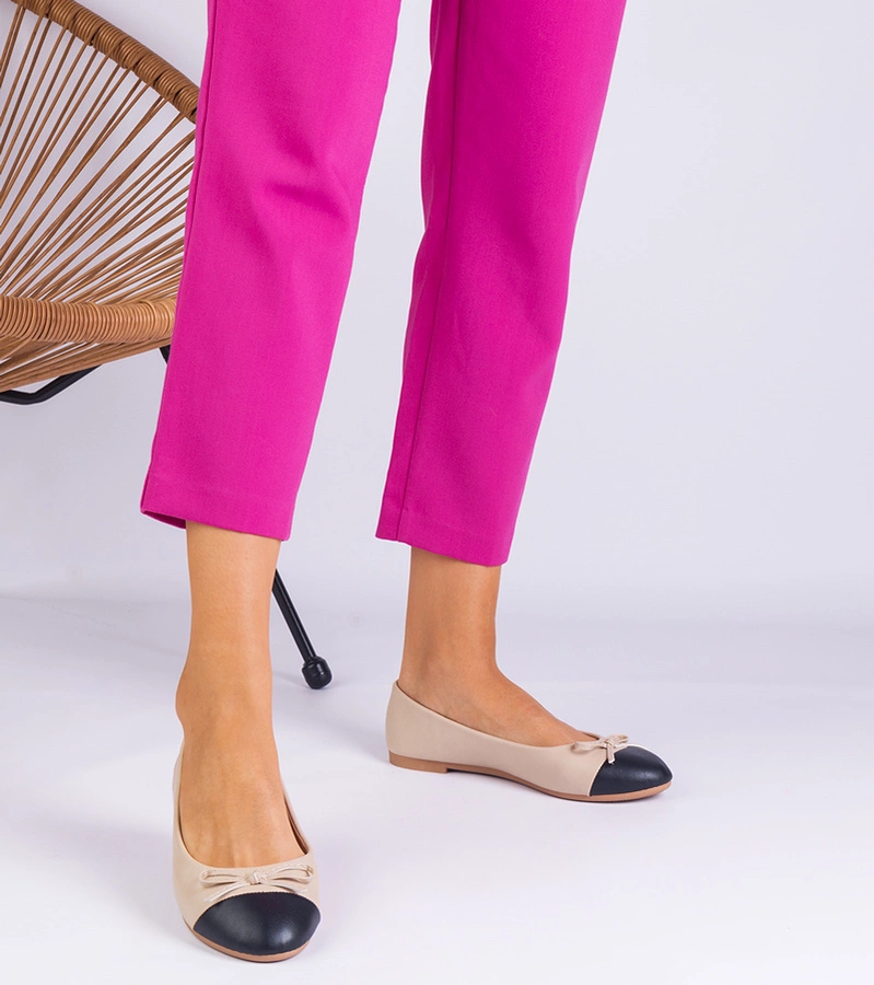 Hers baleriny damskie beżowe z kokardką i czarnym noskiem