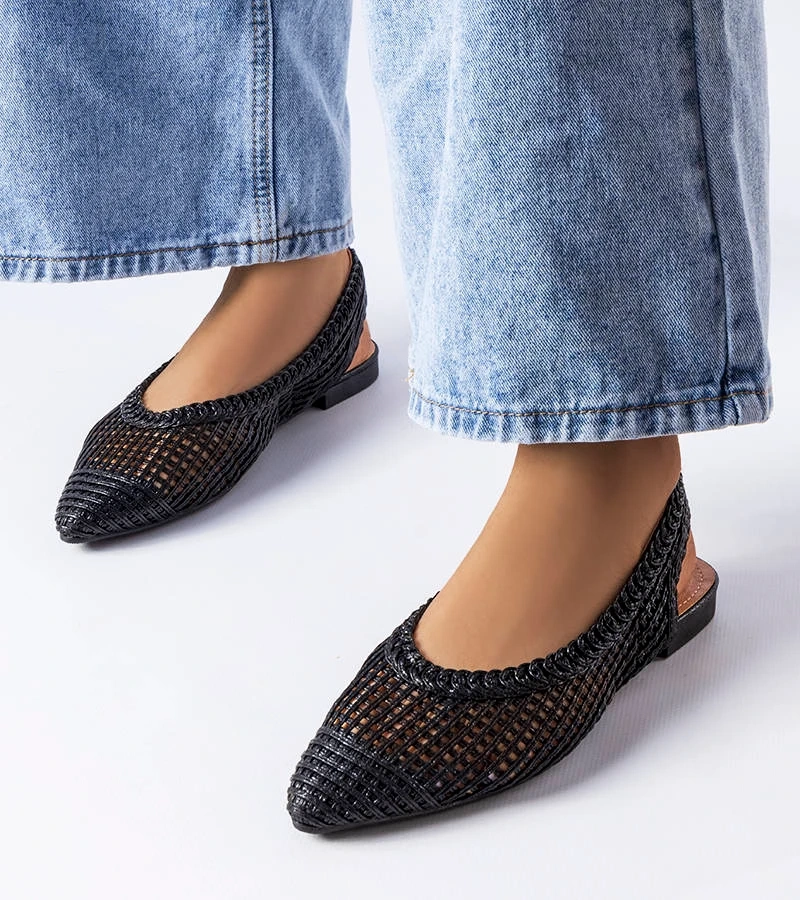Ażurowe czarne balerinki ze szpiczastym noskiem i odkrytą piętą