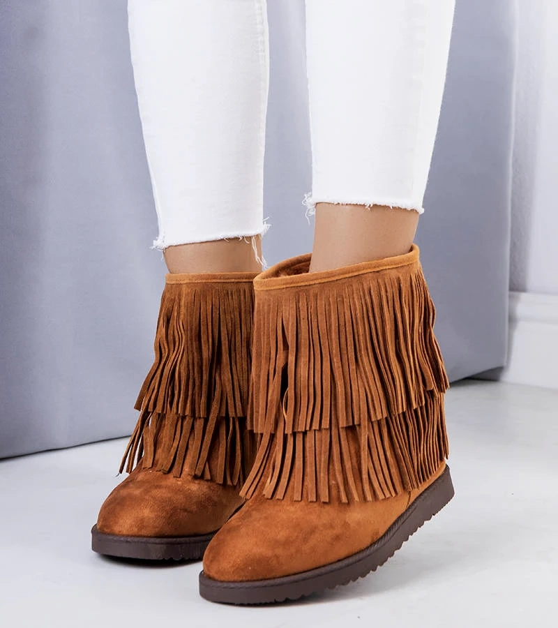 ( ilość produktów: 1778 )Brązowe botki na koturnie zdobione frędzekami