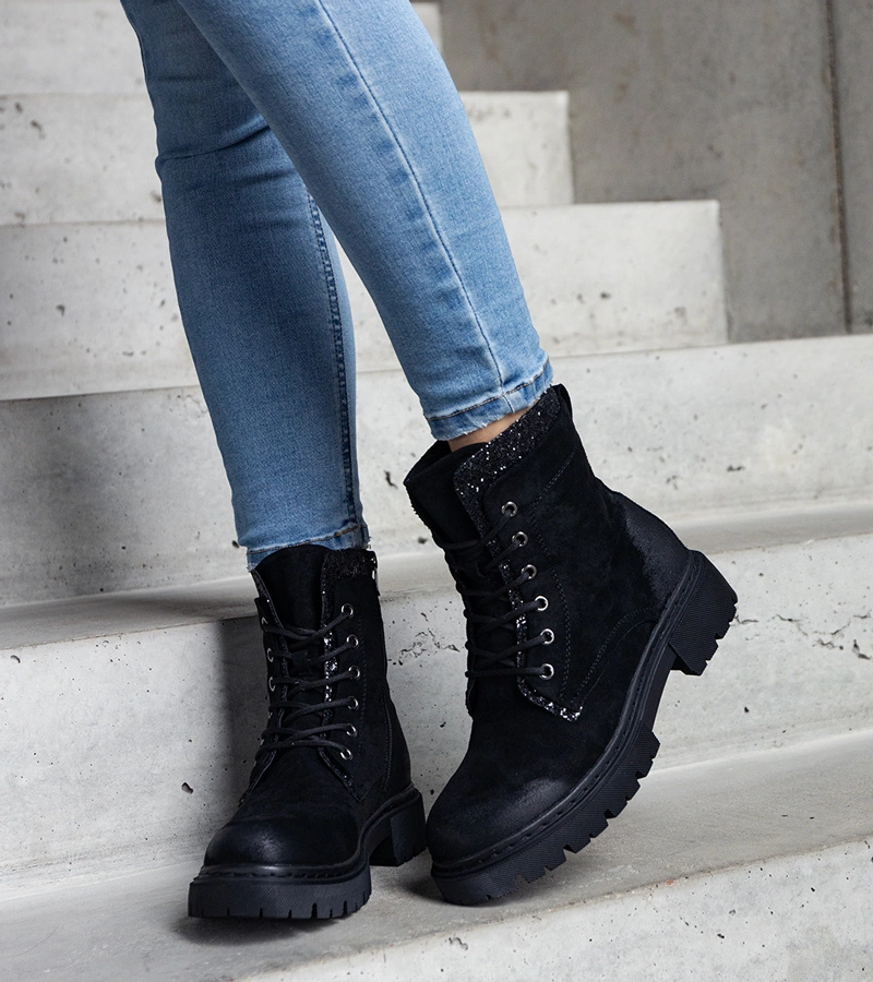Hers Czarne botki z naturalnego zamszu z ozdobną sznurówką