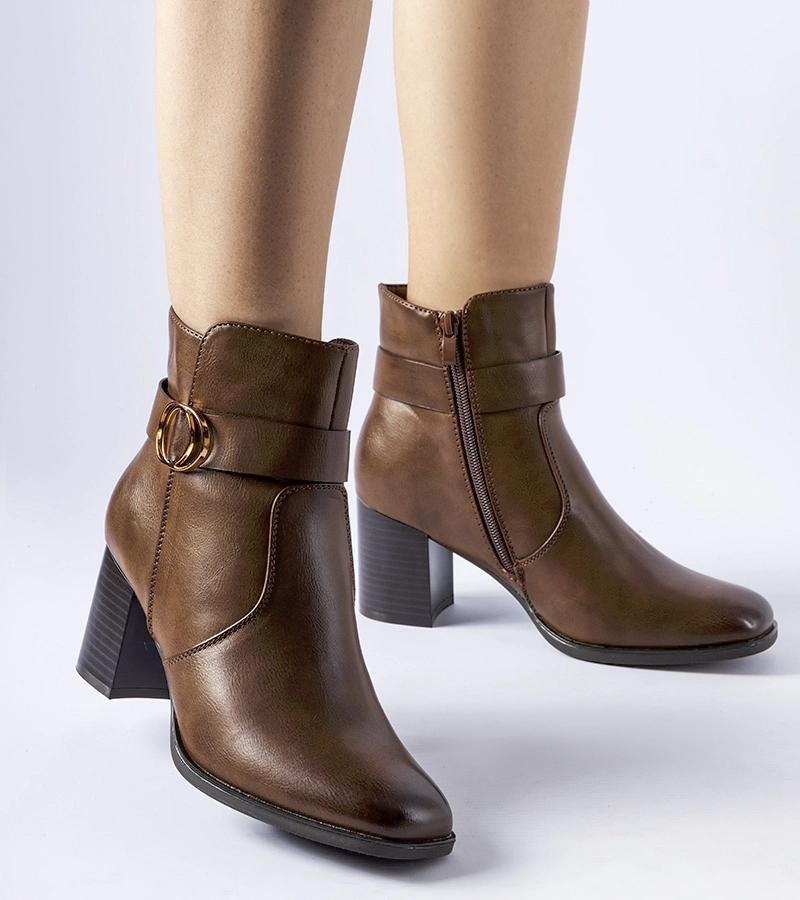 Brązowe botki z metalową wstawką na niskim słupku eko-zamsz