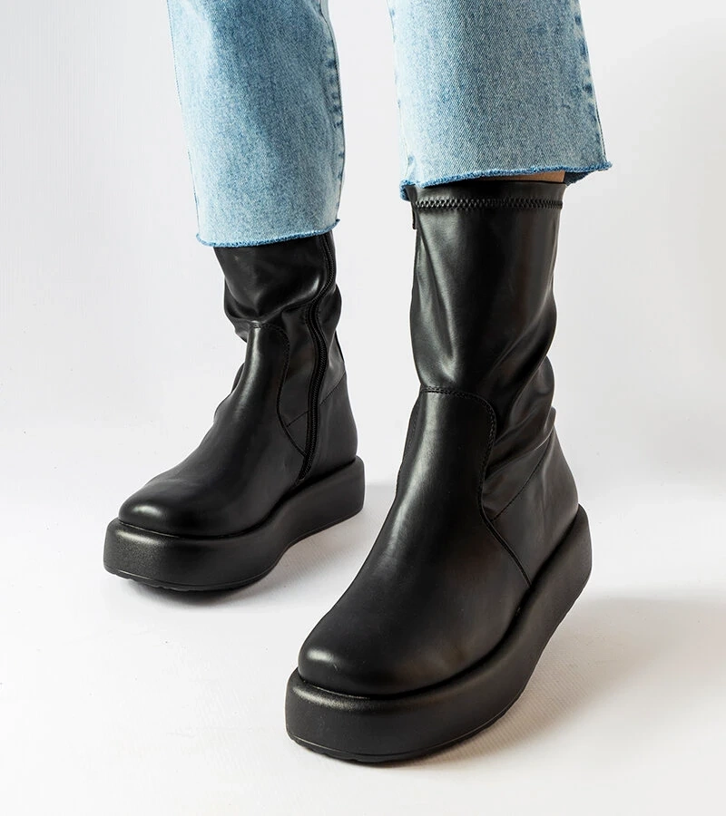 Czarne wysokie botki na grubej platformie eko-zamsz