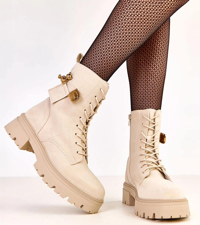 Hers Beżowe botki z ekozamszową cholewką i futerkiem