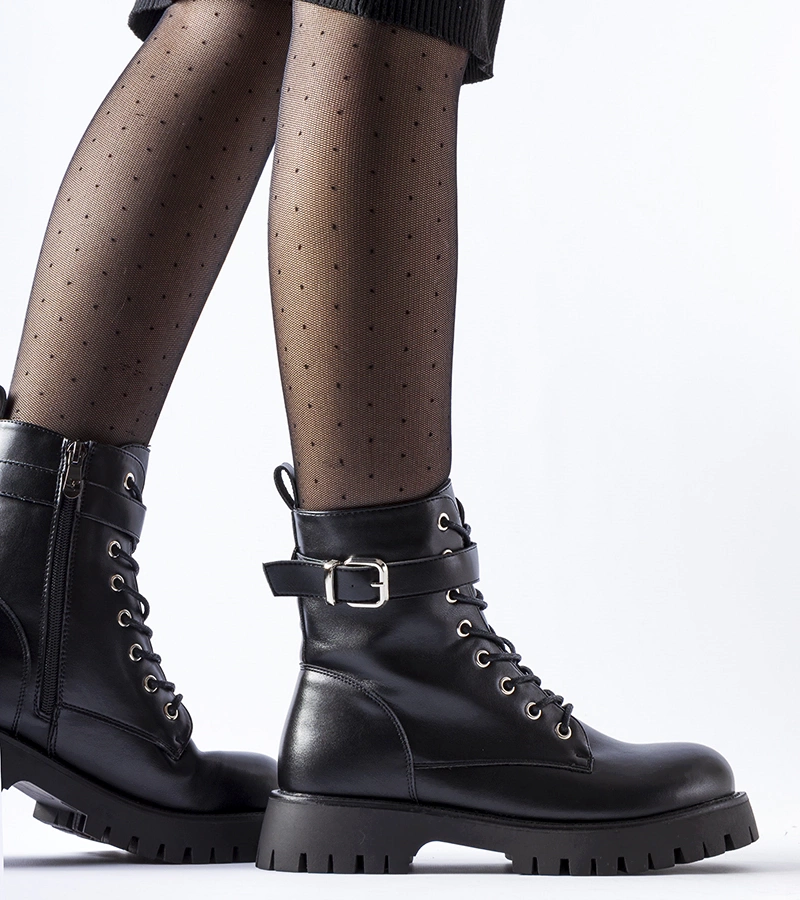 Czarne ocieplane botki na płaskim obcasie z łączonych materiałów