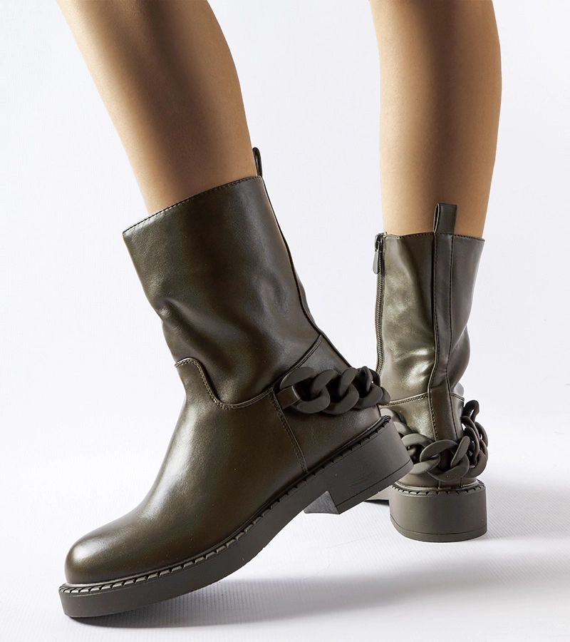 Zielone ocieplane botki z ozdobnym łańcuchem