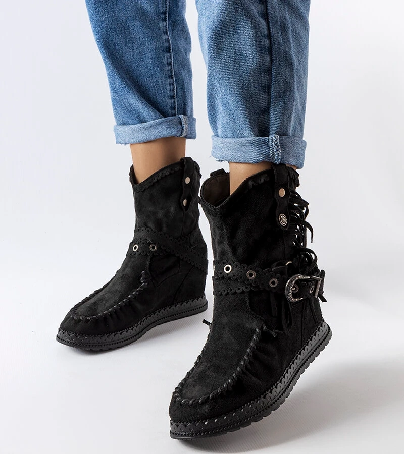 Czarne ocieplane botki na płaskim obcasie z łączonych materiałów