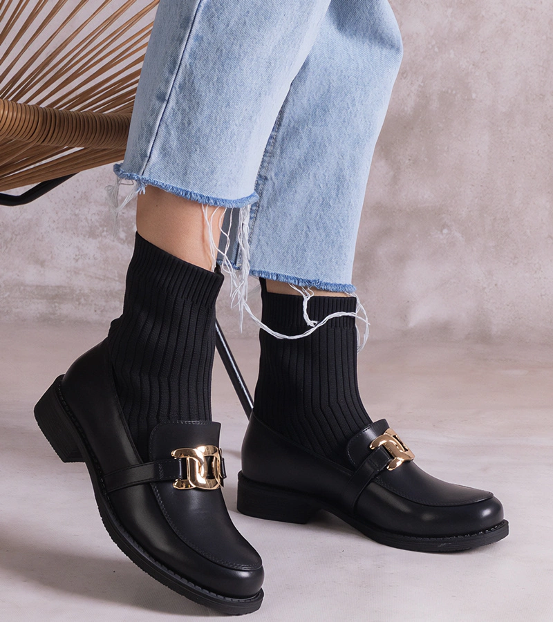 Hers Botki Damskie Czarne Płaskie z Wycięciem i Klamrą