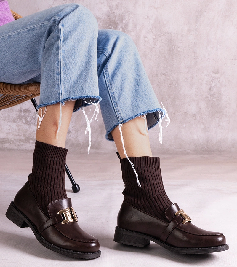 Hers botki płaskie damskie beżowe z materiałową wstawką