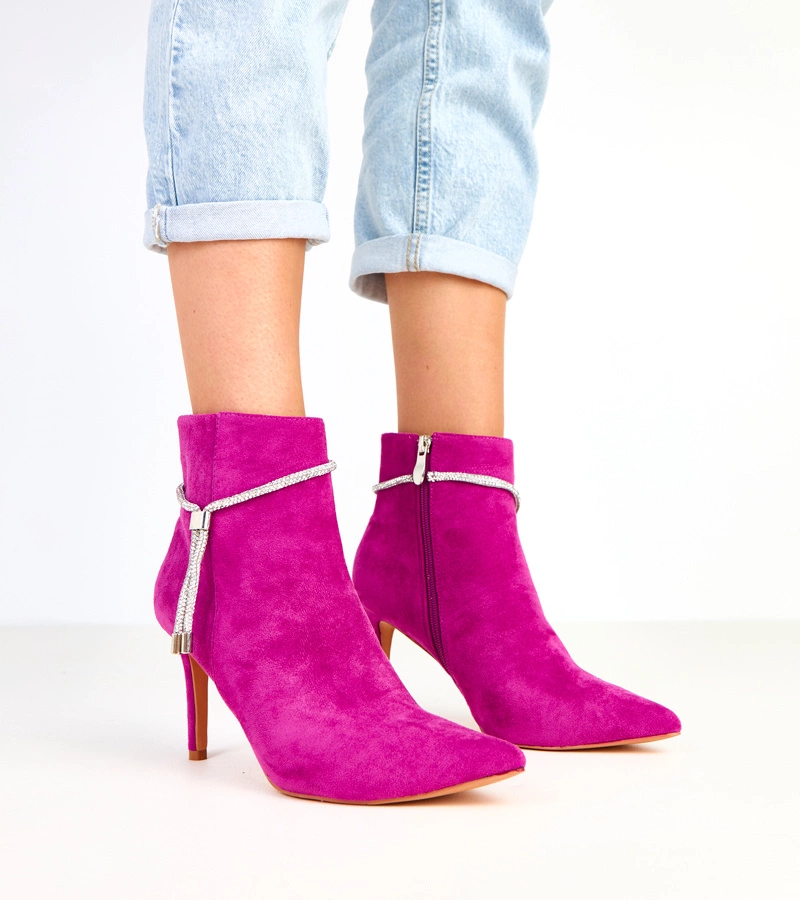 Hers Fioletowe botki na szpilce z ozdobnym łańcuszkiem
