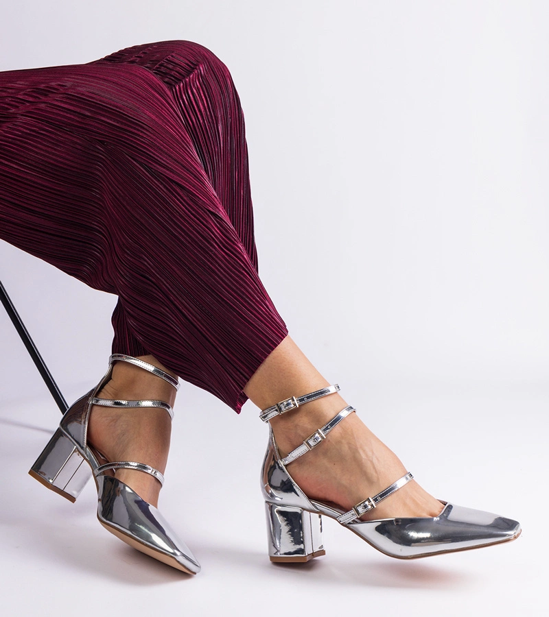 Hers czółenka damskie srebrne lakierowane na słupku ze sprzączkami