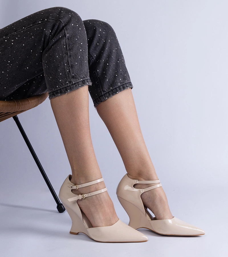 Hers czółenka damskie beżowe lakierowane na koturnie z sprzączkami
