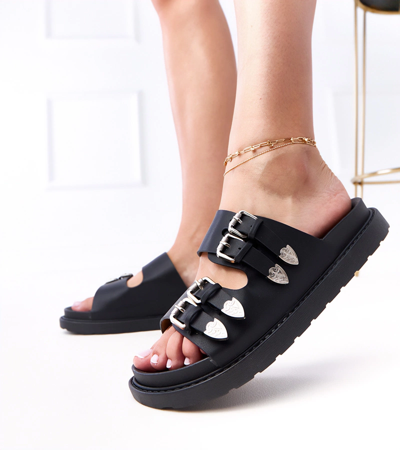 Hers Czarne damskie klapki z ozdobnymi klamrami