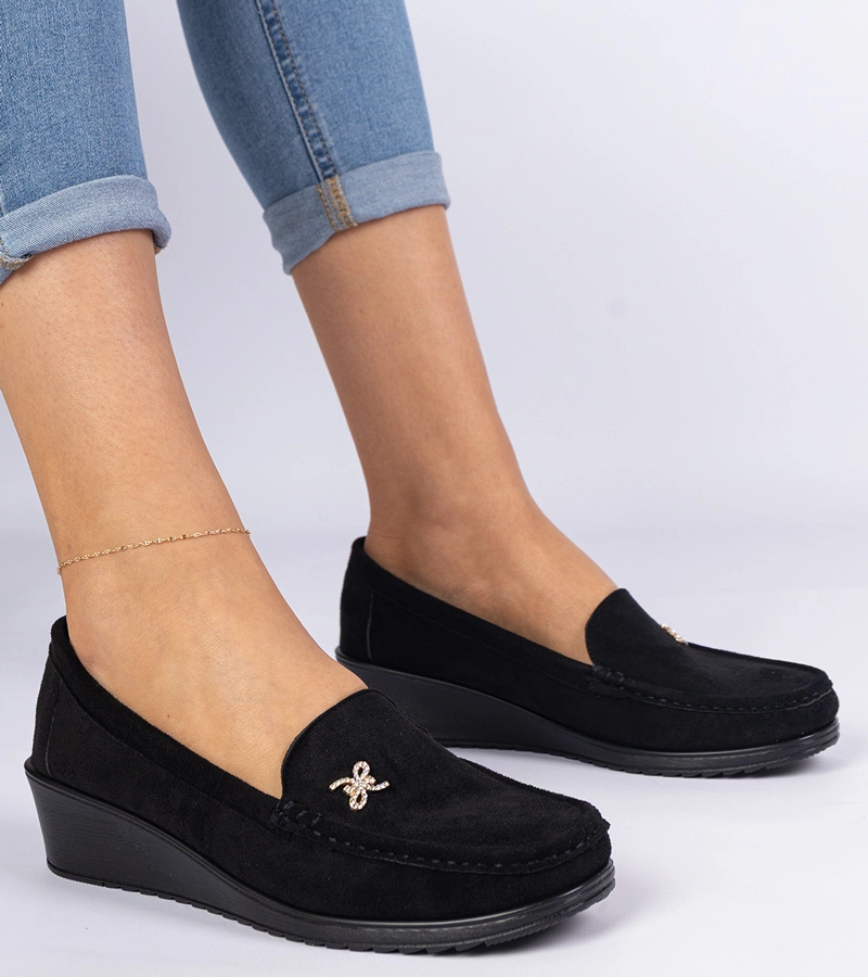 Hers Czarne mokasyny damskie na koturnie z ekozamszu