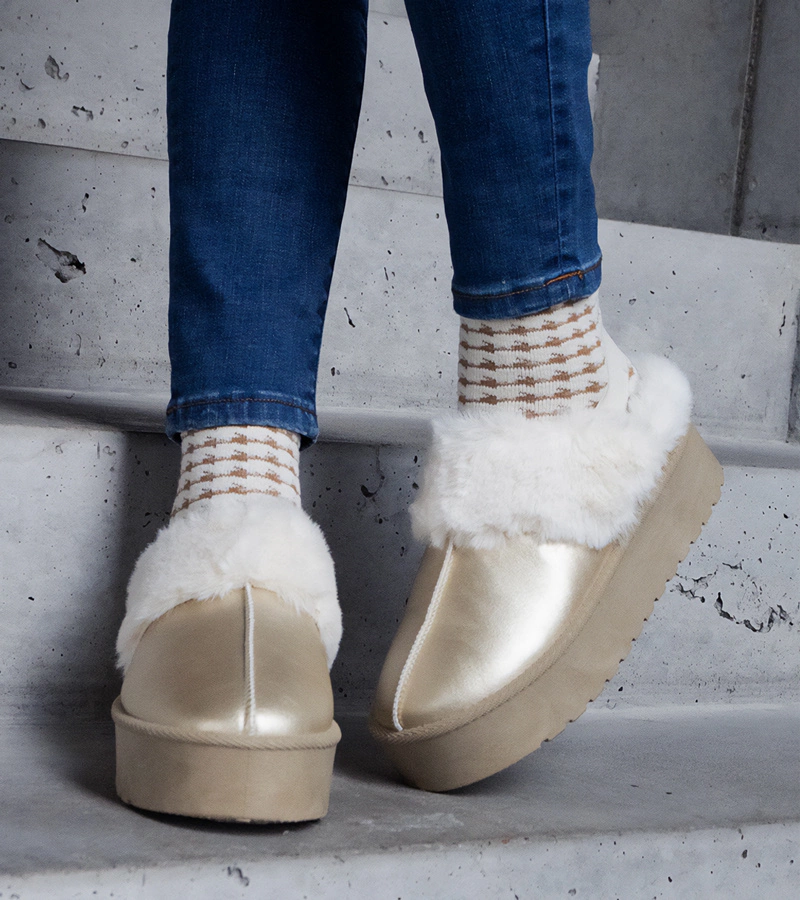 Złote kapcie na platformie ozdobione futerkiem z gumką przy pięcie