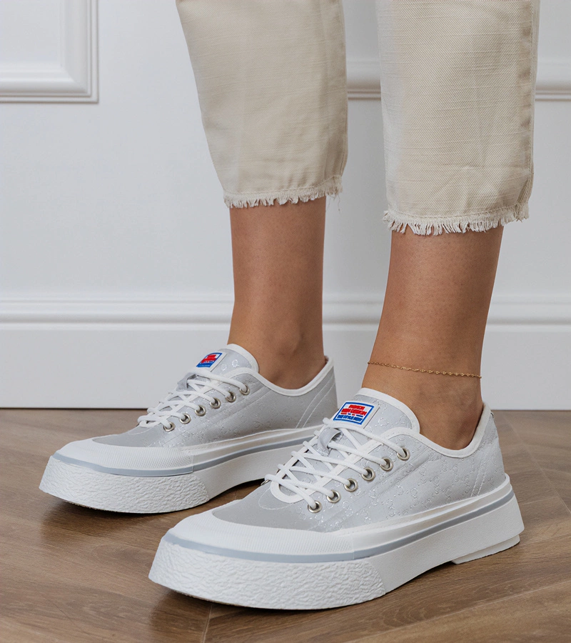Hers Srebrne sneakersy damskie z satynowymi sznurówkami