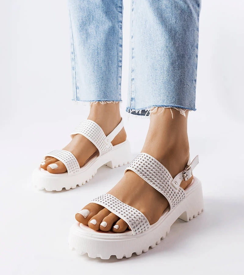 Hers Białe klapki z paskami i cyrkoniami na klamrach