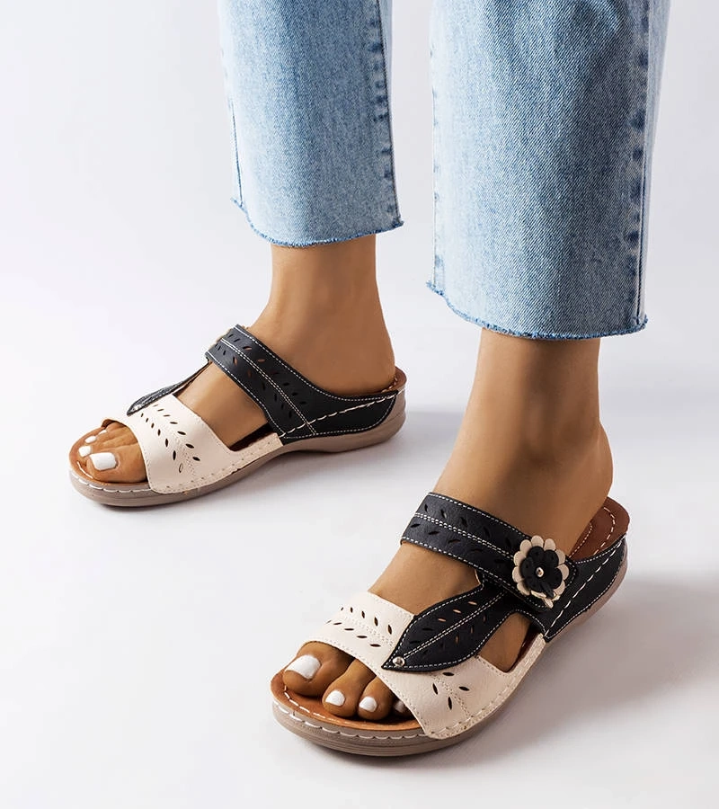 Hers Czarne klapki z klamrami i haftem na paskach