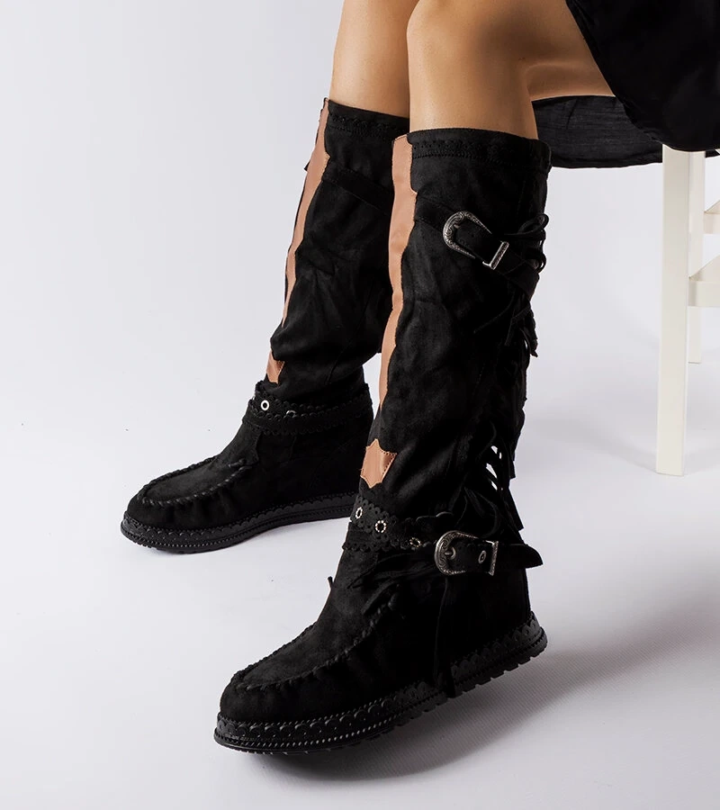 Hers Czarne kozaki na koturnie z frędzelkami