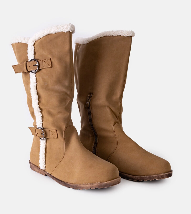 Beżowe kozaki z eko skóry na płaskim obcasie zdobione zamkiem