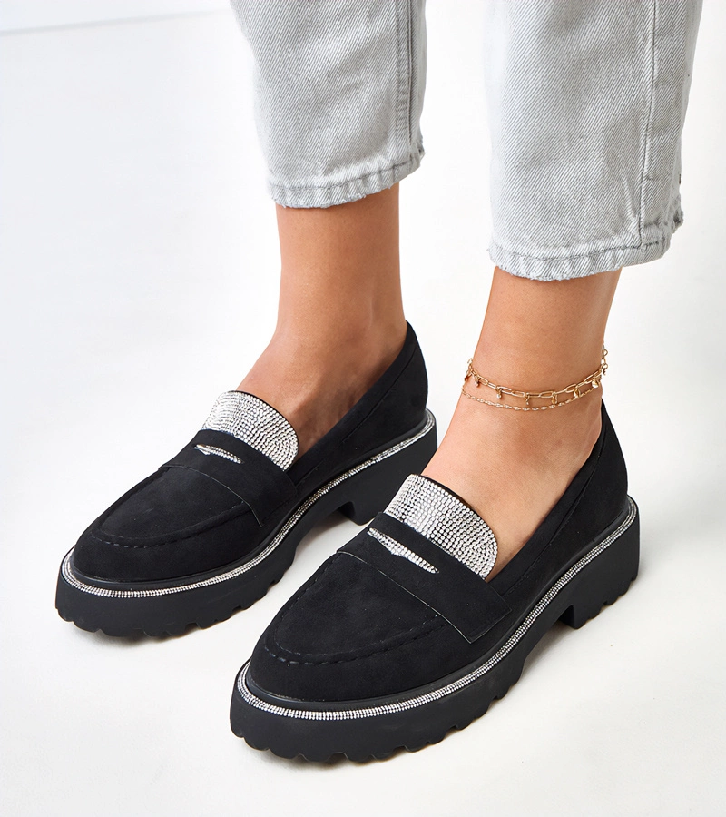 Hers Czarne mokasyny ekozamszu zdobione cyrkoniami