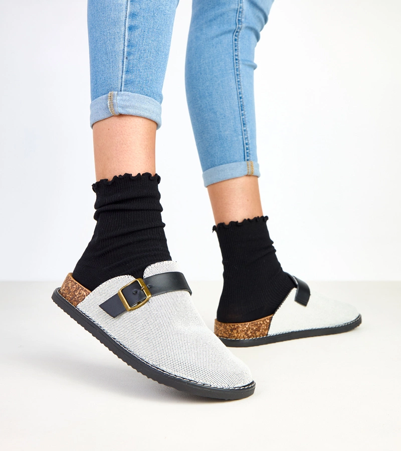 Beżowe eleganckie klapki ze zdobiona cholewką