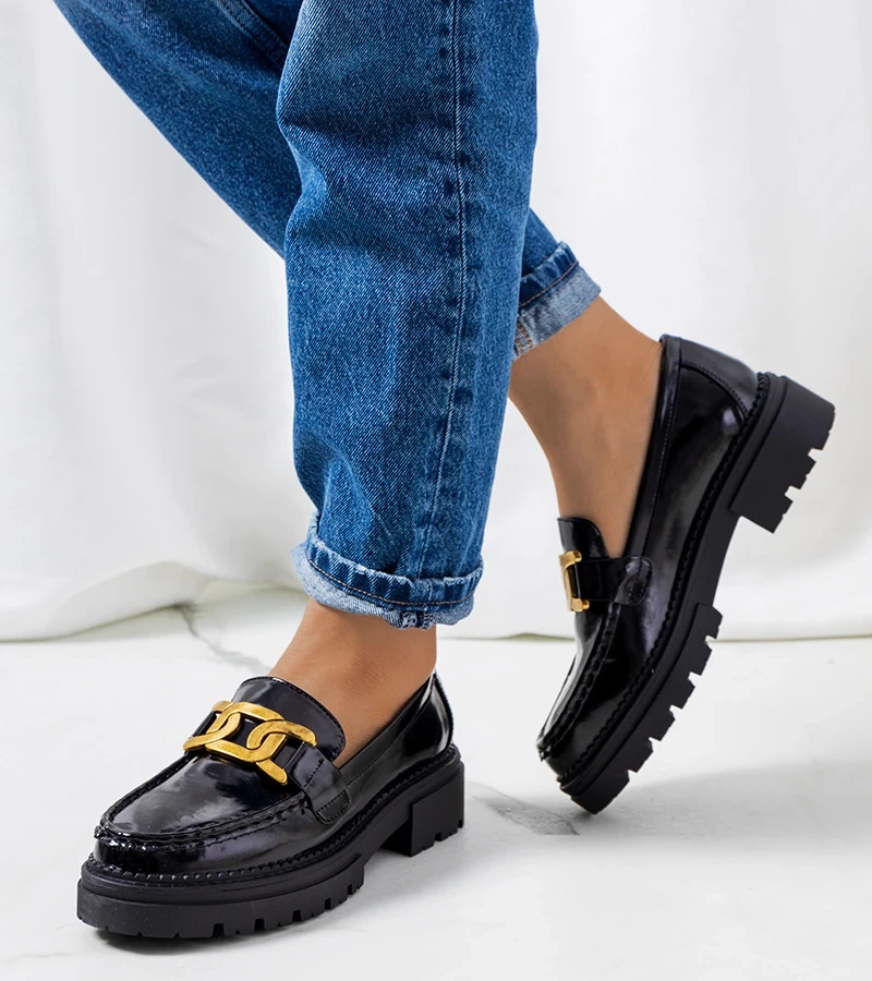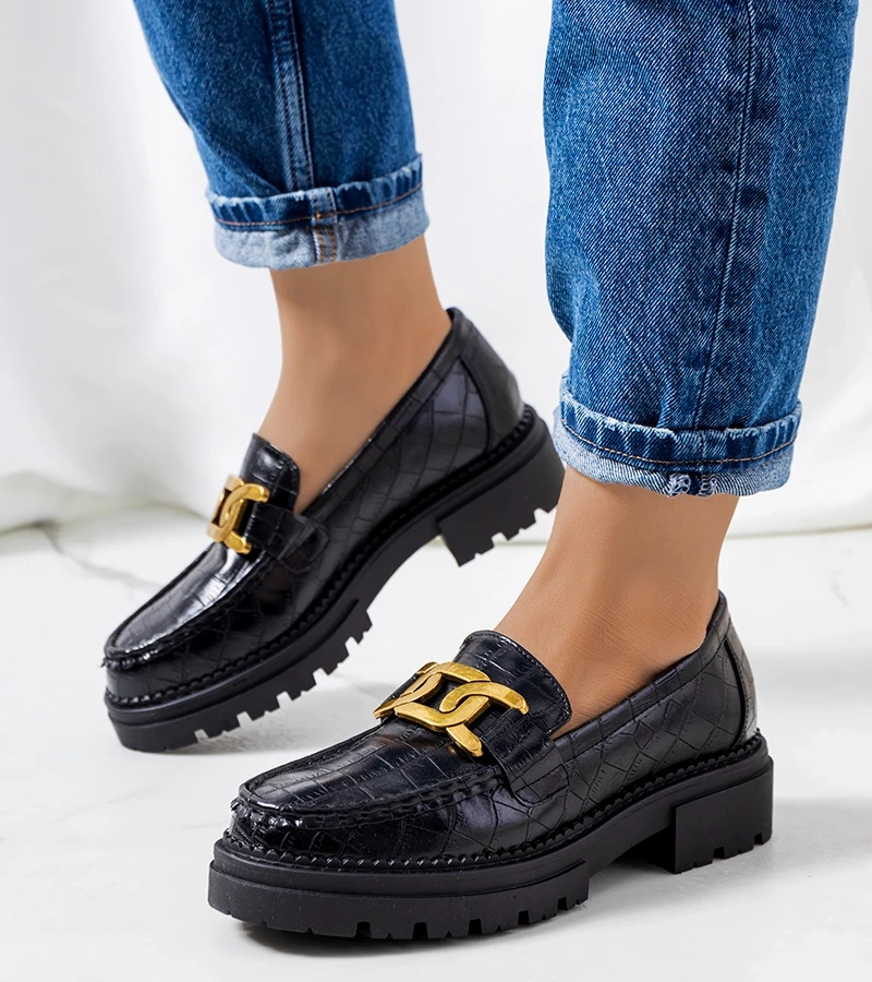 Czarne czółenka na klocku zdobione złotym kółkiem