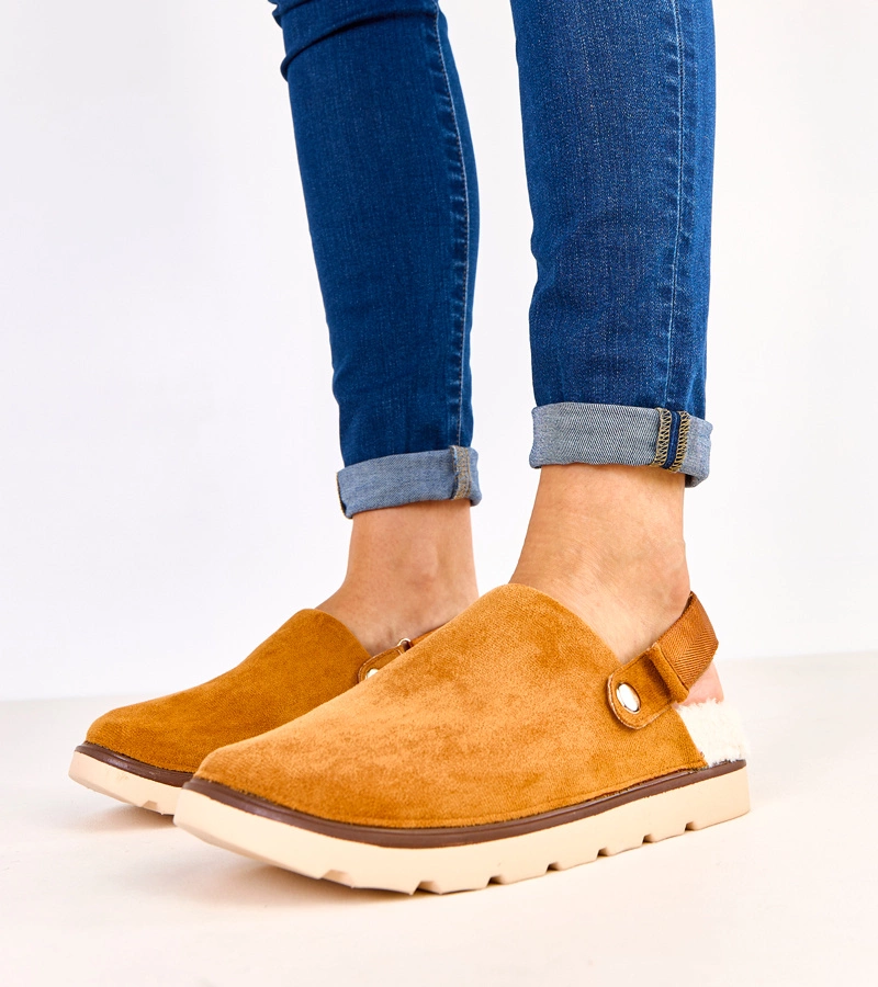 Hers Brązowe botki ekozamszowe ze złotą ozdobą