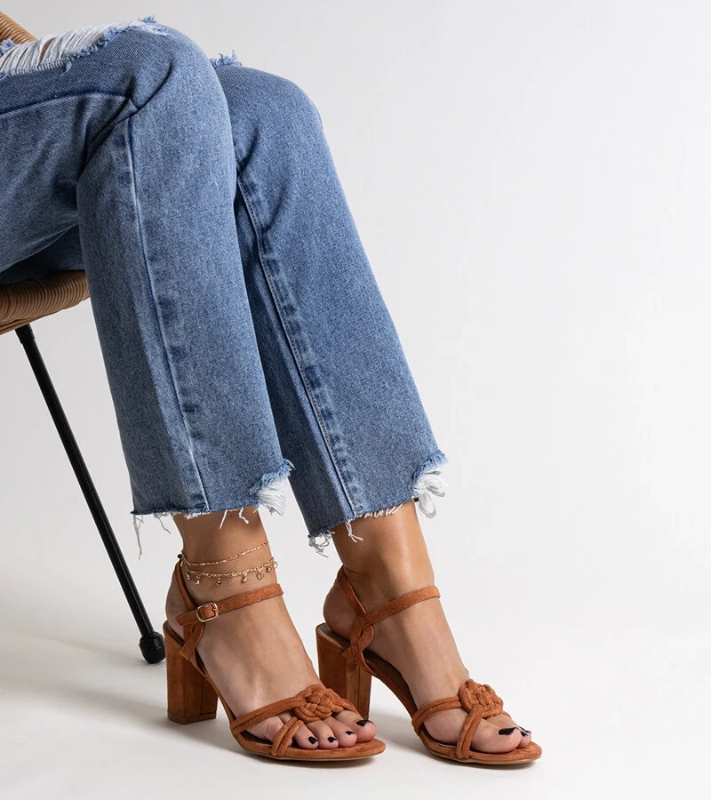Hers Beżowe sandały na koturnie z plecionym paskiem