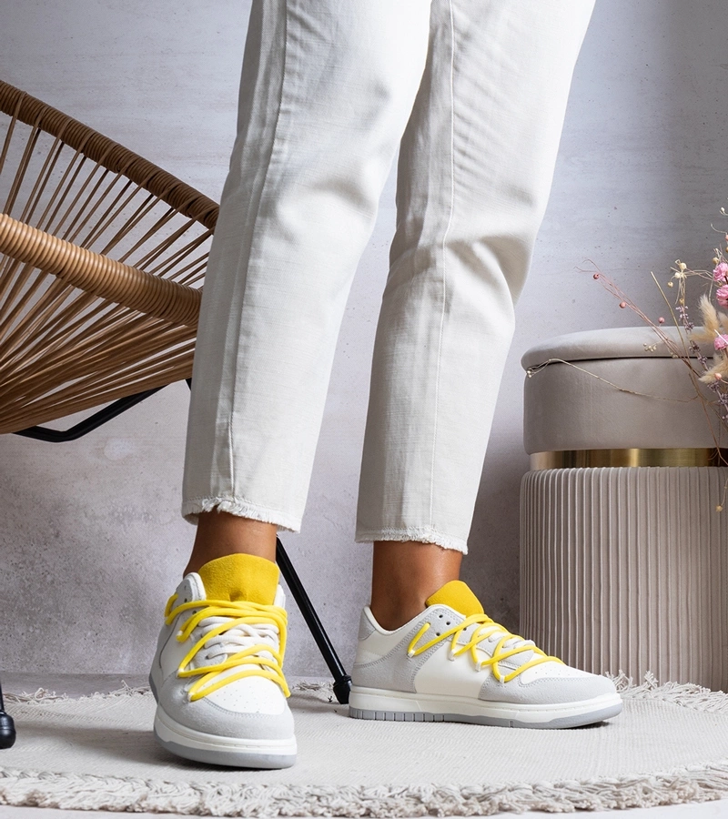 Hers Szare sneakersy z żółtymi sznurówkami