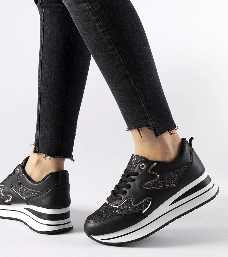 Czarne sneakersy na platformie zdobione cyrkoniami