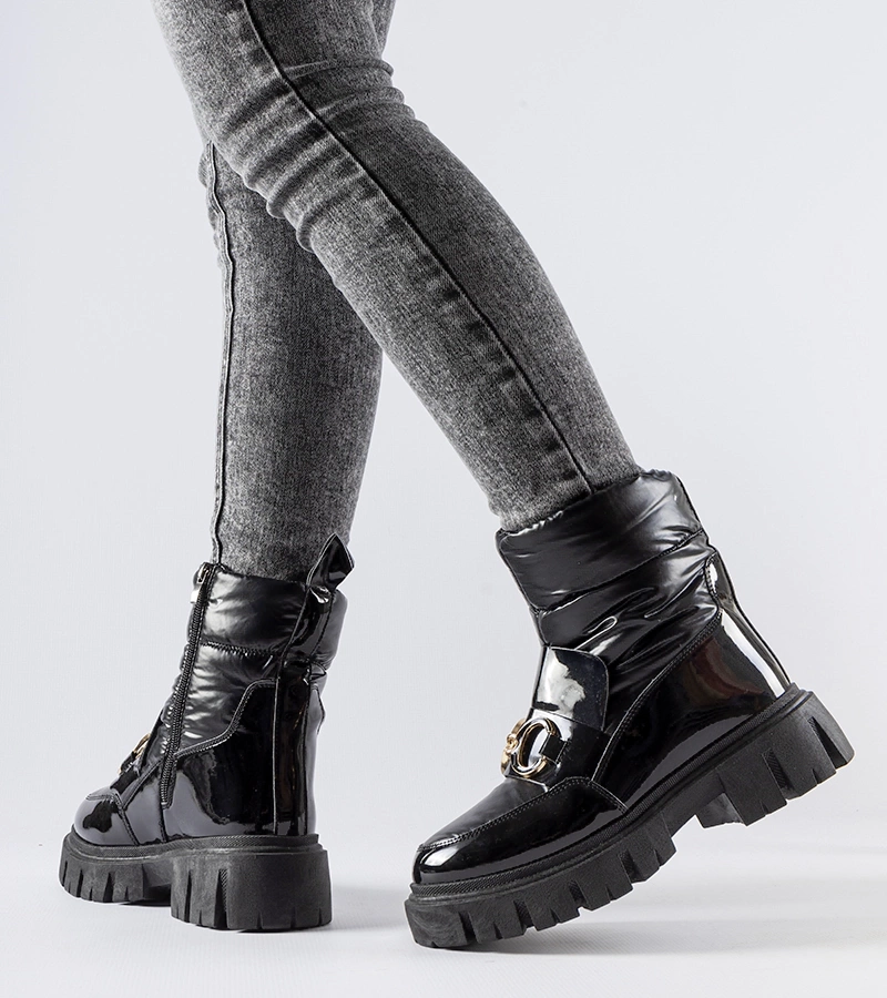 Czarne lakierowane śniegowce z futerkiem na platformie