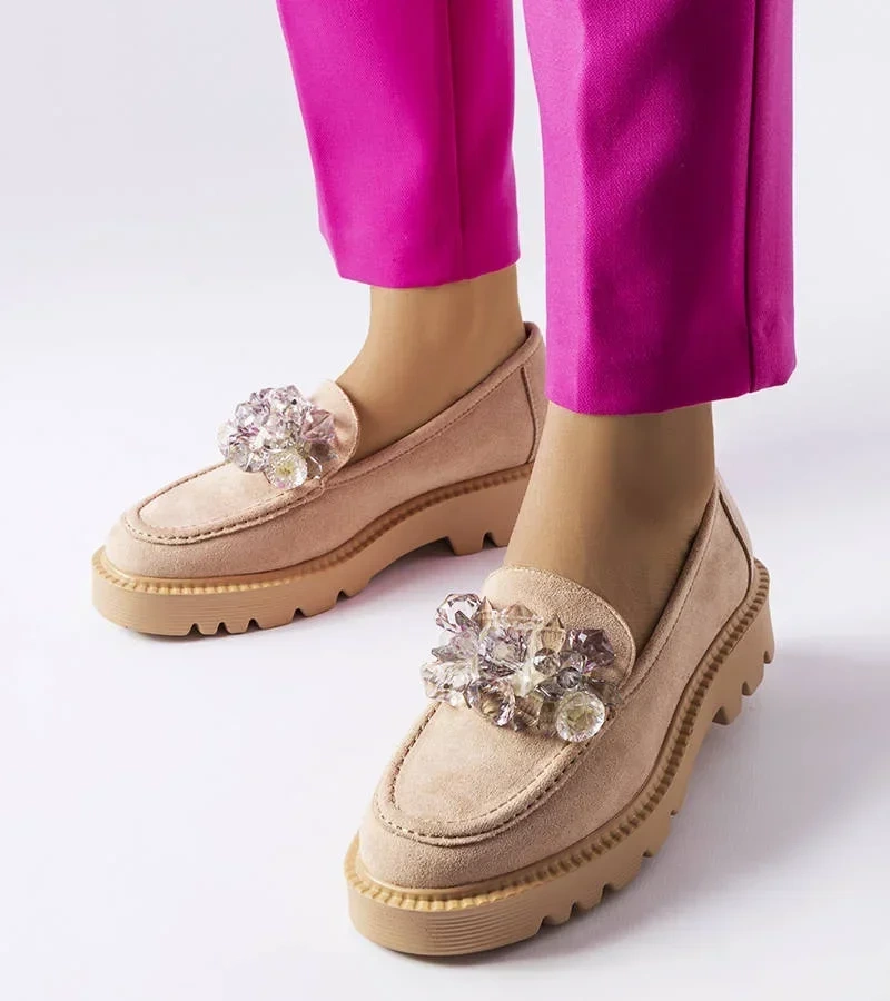 Beżowe mokasyny bogato zdobione plastikowymi kryształkami Vinceza